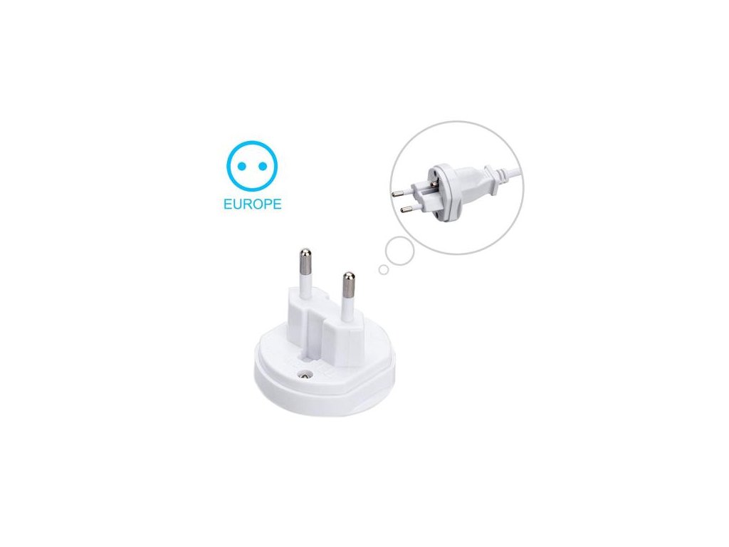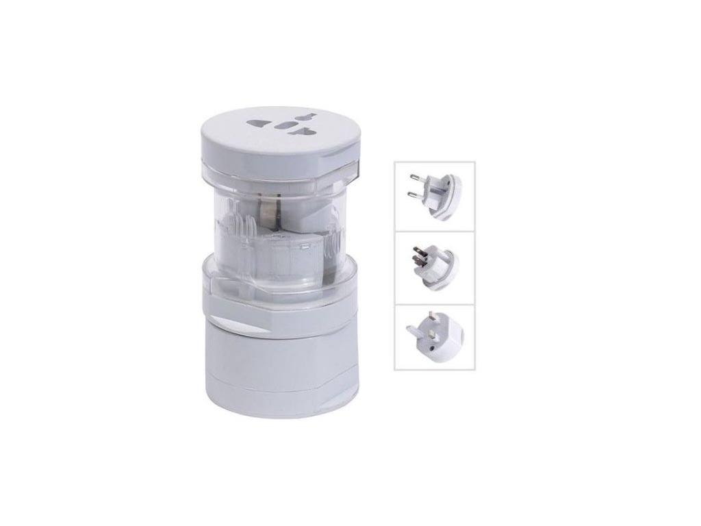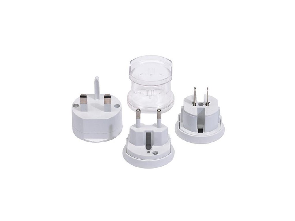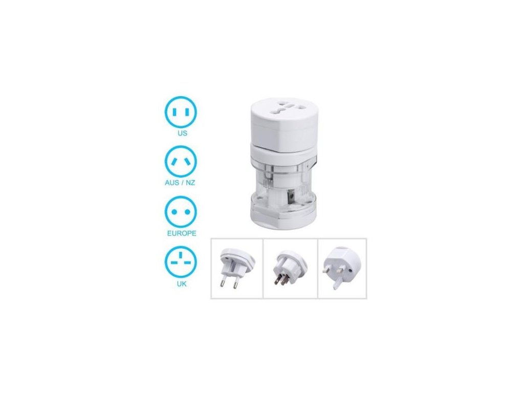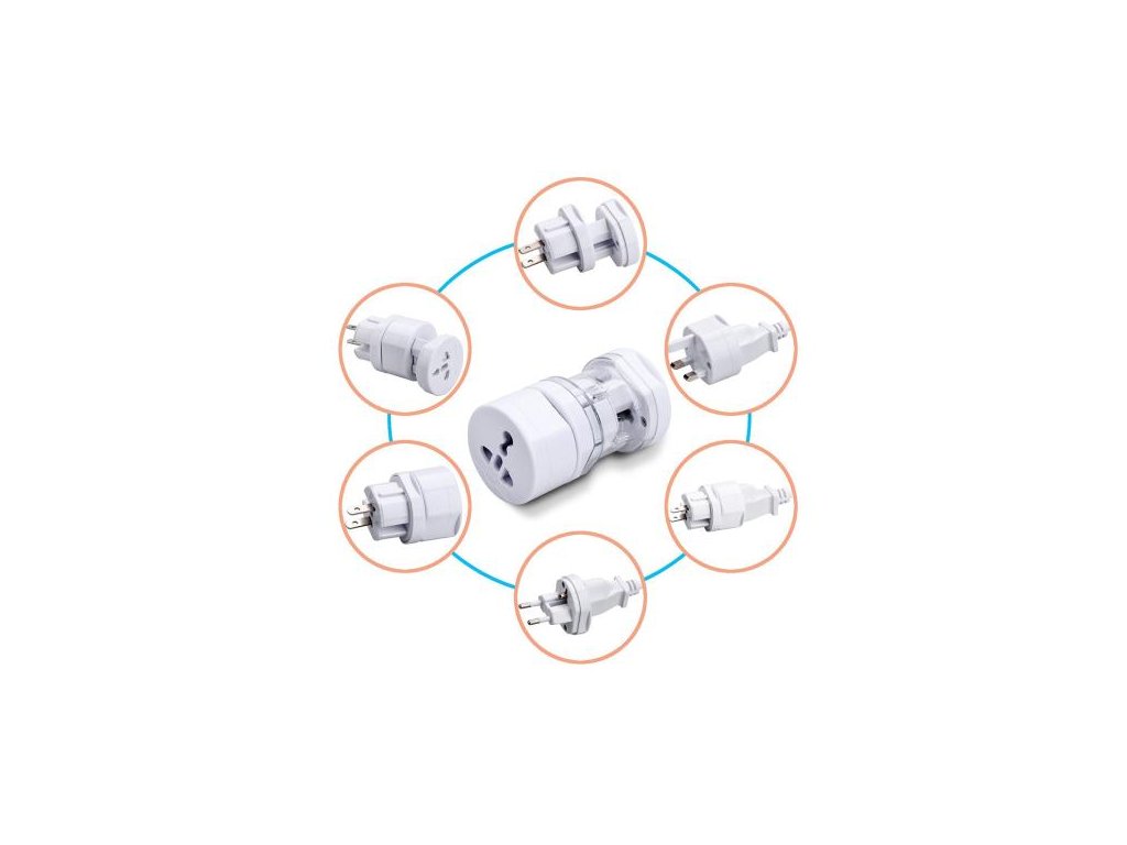 Malý, skládací, cestovní adaptér síťových zásuvek zajišťuje to, aby váš el. spotřebič mohl být zapojen do jakékoliv zásuvky po celém světě. Výběrem potřebné hlavice adaptéru můžete vidlici zastrčít do určité zásuvky. Adaptér je složen ze 3 hlavic a to jedna je nastavitelná pro 2 zásuvkové systémy pro US a pro Austrálii - viz obrázek.