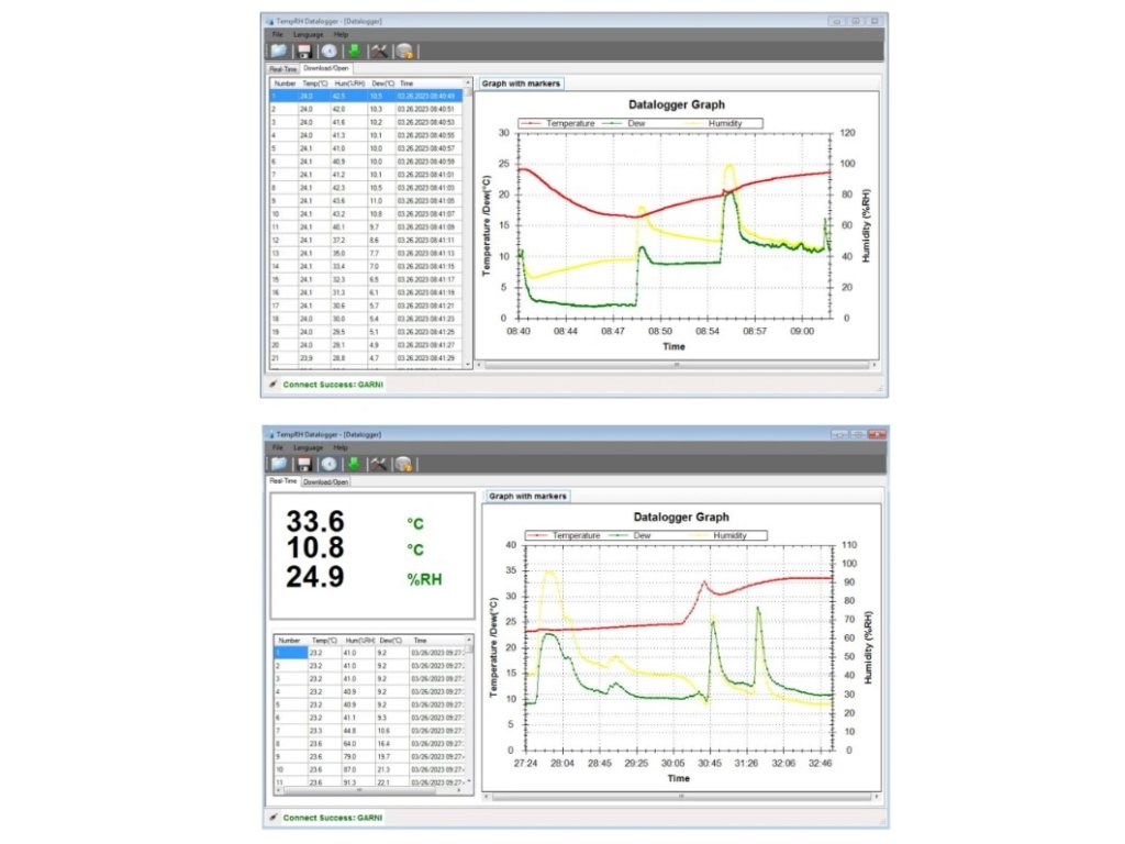 - program TempRH Datalogger V2.2pro zobrazení naměřených hodnot, pro stahování dat, nastavení dataloggeru tvorbu grafů