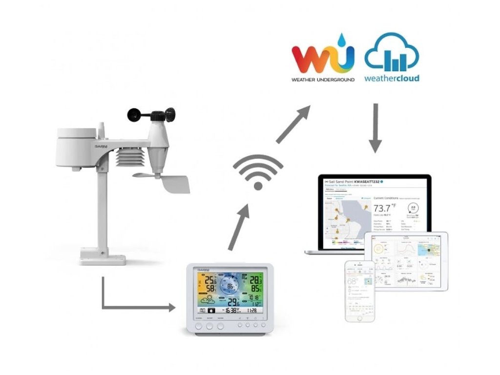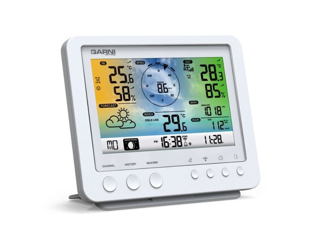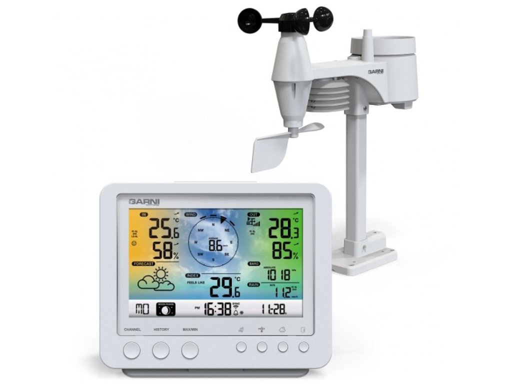 Wi-Fi meteorologická stanice s integrovaným bezdrátovým čidlem 5 v 1 model GARNI 975 je vybavena mnoha funkcemi zajišťujícími informace o předpovědi počasí. Integrované bezdrátové čidlo pracuje na frekvenci 868 MHz a měří teplotu, relativní vlhkost, rychlost a směr větru a dešťové srážky.