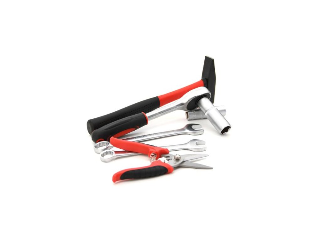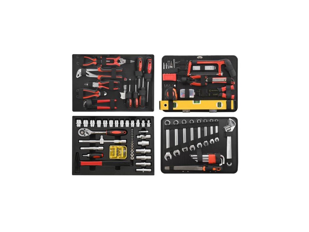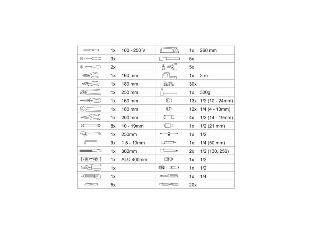1x zkoušečka 100 - 250 V 3x šroubovák křížový 2x šroubovák plochý 1x kleště štípací 160 mm 1x kleště kombinované 180 mm 1x kleště siko 250 mm 1x kleště prodloužené 160 mm 1x kleště na hřebíky 180 mm 1x nůžky na plech 200 mm 8x klíč plochý (10, 11, 12, 13, 14, 15, 17, 19mm) 1x nastavitelný klíč 250mm 9x imbus klíč (1.5, 2, 2.5, 3, 4, 5, 6, 8, 10mm) 1x pilník 300mm 1x vodováha 400mm 1x konektorové kleště 1x nůž 5x náhradní břit pro nůž 1x pilka 260 mm 5x sekáč malý 5x kleště na segrovky s nástavci 1x metr svinovací 3 m 30x konektory 1x kladivo 300g 13x nástavec 1/2 (10, 11, 12, 13, 14, 15, 16, 17, 19, 20, 21, 22, 24mm) 12x nástavec 1/4 (4, 4.5, 5, 5.5, 6, 7, 8, 9, 10, 11, 12, 13mm) 4x nástavec 1/2 dlouhý (14, 15, 17, 19 mm) 1x nástavec 1/2 dlouhý na svíčky (21 mm) 1x T vratidlo pro nástavce 1/2 1x nástavec 1/4 prodlužovací 50 mm 2x nástavec 1/2 prodlužovací 130mm a 250 mm 1x nástavec 1/2 kloubový 1x ráčna 1/2 1x ráčnový šroubovák 1/4 20x bity (plochý, křížový, imbus, torx)