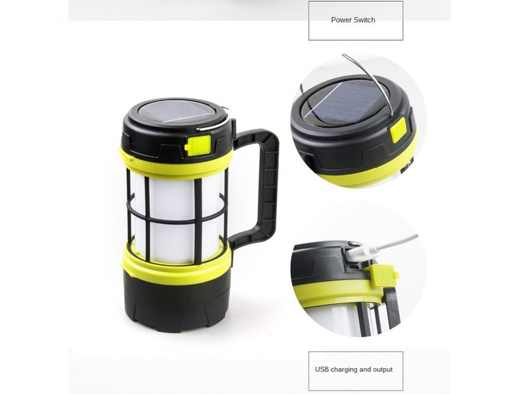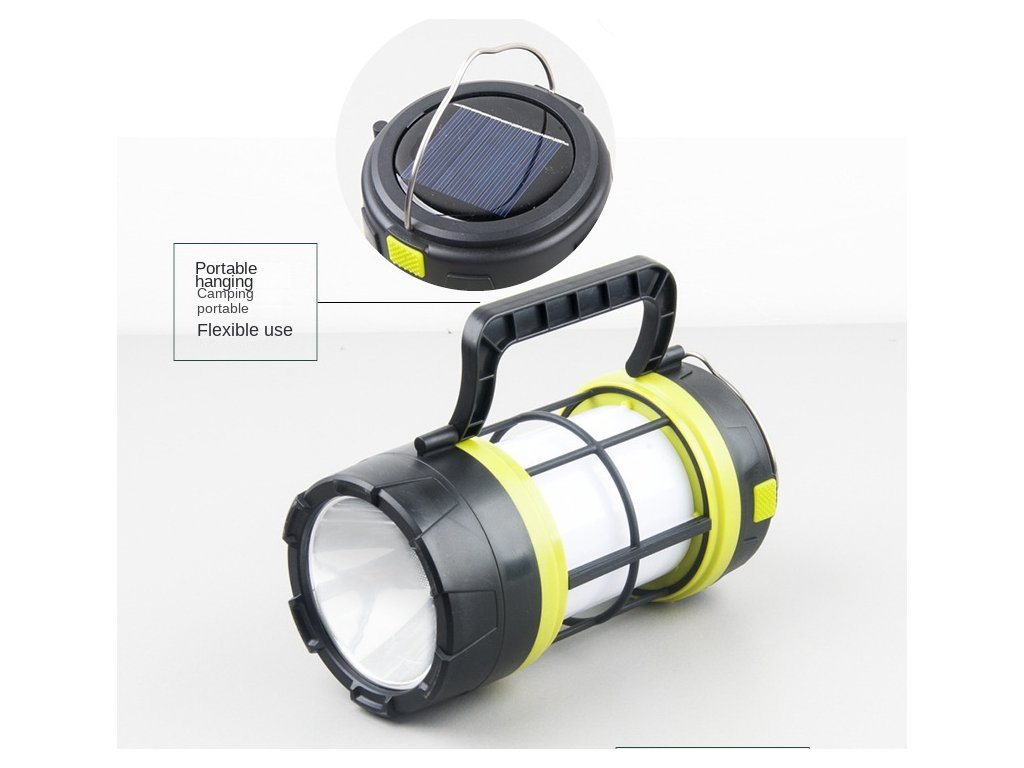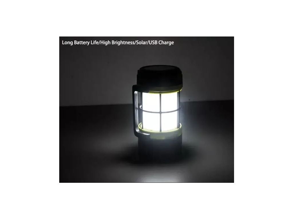 Multifunkční nabíjecí LED svítilna s možností prostorového svitu nebo reflektorového bodového svitu. Vestavěný dobíjecí akumulátor Li-Ion a vestavěný solární panel pro dobíjení LED svítilny pomocí slunečního záření. Možnost postavení LED svítilny na stůl a přepínačem rozsvítíte lampičku s prostorovým svitem (2 úrovně svitu) a dalším stlačením tlačítka rozsvítíte přední reflektor (2 úrovně svitu a blikání). Možnost nabíjení ze zásuvky USB.