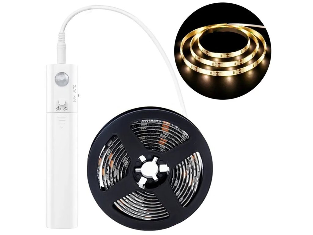 Sada obsahuje vestavěný senzor soumraku a pohybu (PIR). Fyzický spínač umožňuje trvalé vypnutí pásku. K dispozici jsou dva provozní režimy dle vašich potřeb (automatický a manuální). Díky svým malým rozměrům je pásek ideální pro osvětlení vnitřku skříní a prostorů pod a za nábytkem.