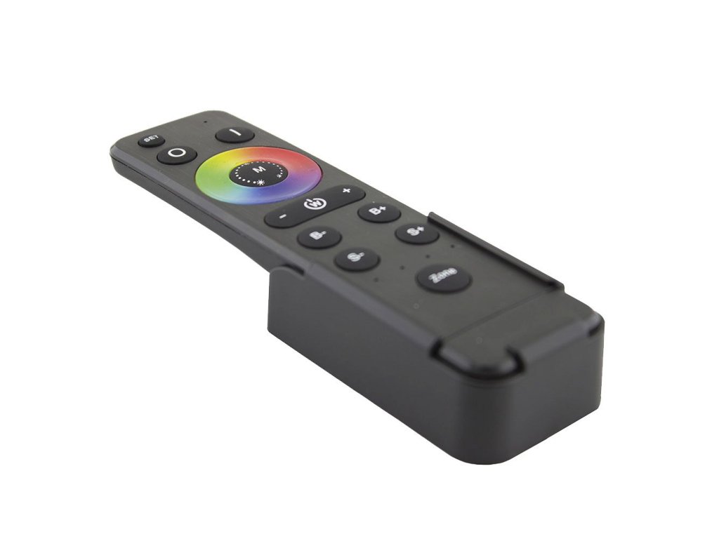 Ovladač (RF) dotykový ruční pro LED pásky 4v1, černý, 4-zónový.  Dálkové ovládání je jedním z prvků chytrého ovládacího systému pro LED pásky. Vždy je zapotřebí vybrat alespoň jeden typ ovladače a přijímače.