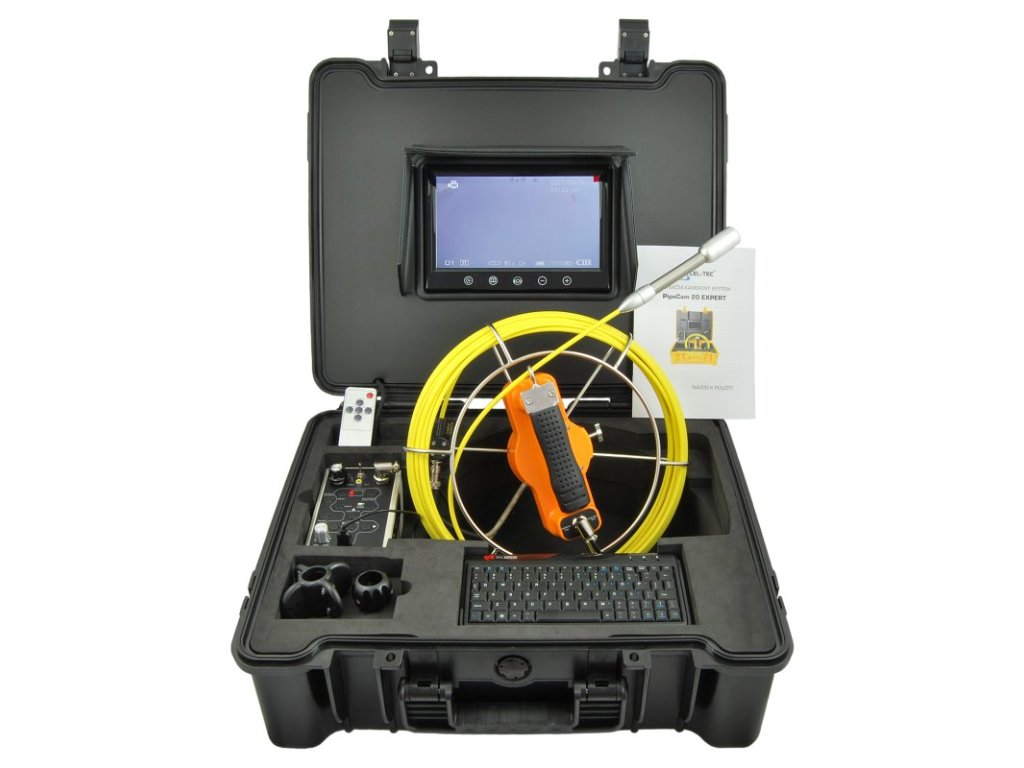 Inspekční kamera PipeCam 40 Expert s 40m kabelem, zobrazovací jednotkou, měřič vzdálenosti a klávesnicí je zařízení určené pro inspekci kanalizací, odpadů, drenáží, studen, komínů atd. Zobrazovací jednotka 9“ je umístěna v horním víku. 20m kabel je obalený skelným vláknem (pružný, pevný). Kabel i kamera jsou vodotěsné. Záznam je barevný, rozlišení 720 x 576 pixelů.