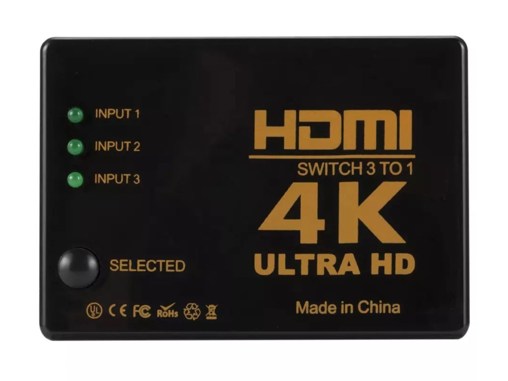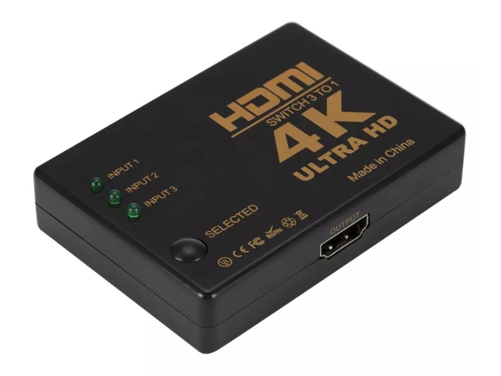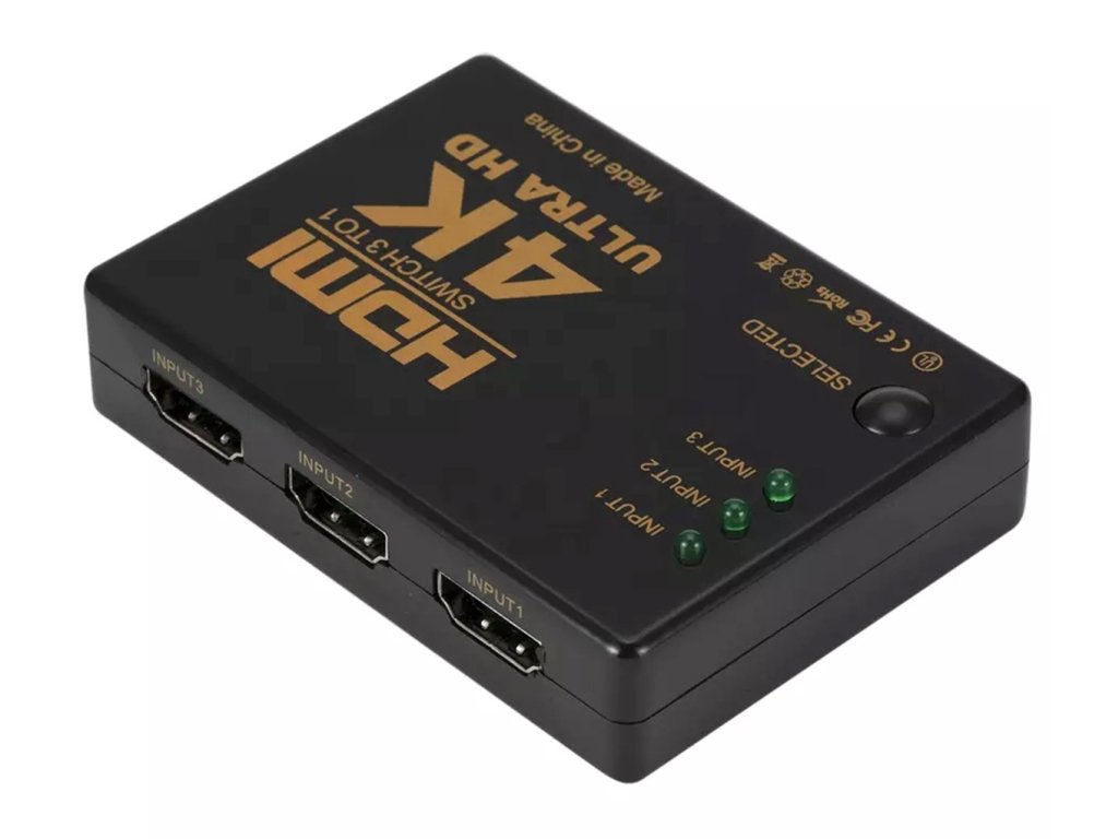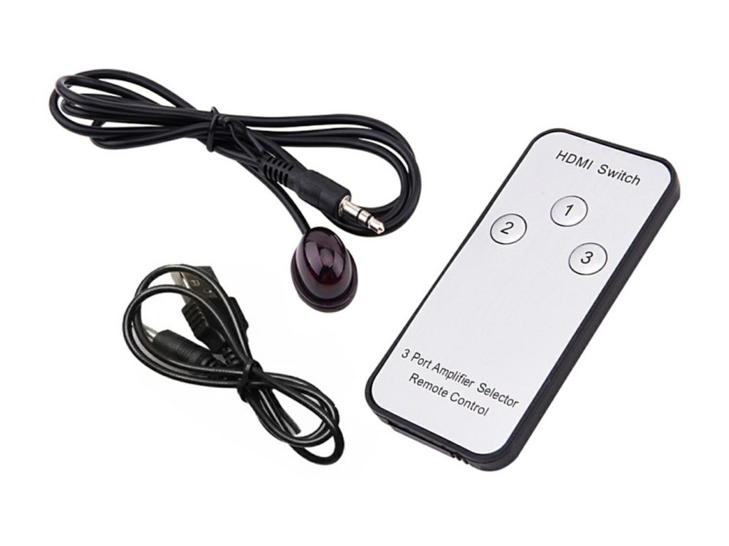 - Kompaktní HDMI rozbočovač vybavený 3 porty HDMI typu A. Rozbočovač (přepínač) je vybaven přídavným IR dálkovým ovládáním pro dálkové přepínání signálu a infračerveným přijímačem.