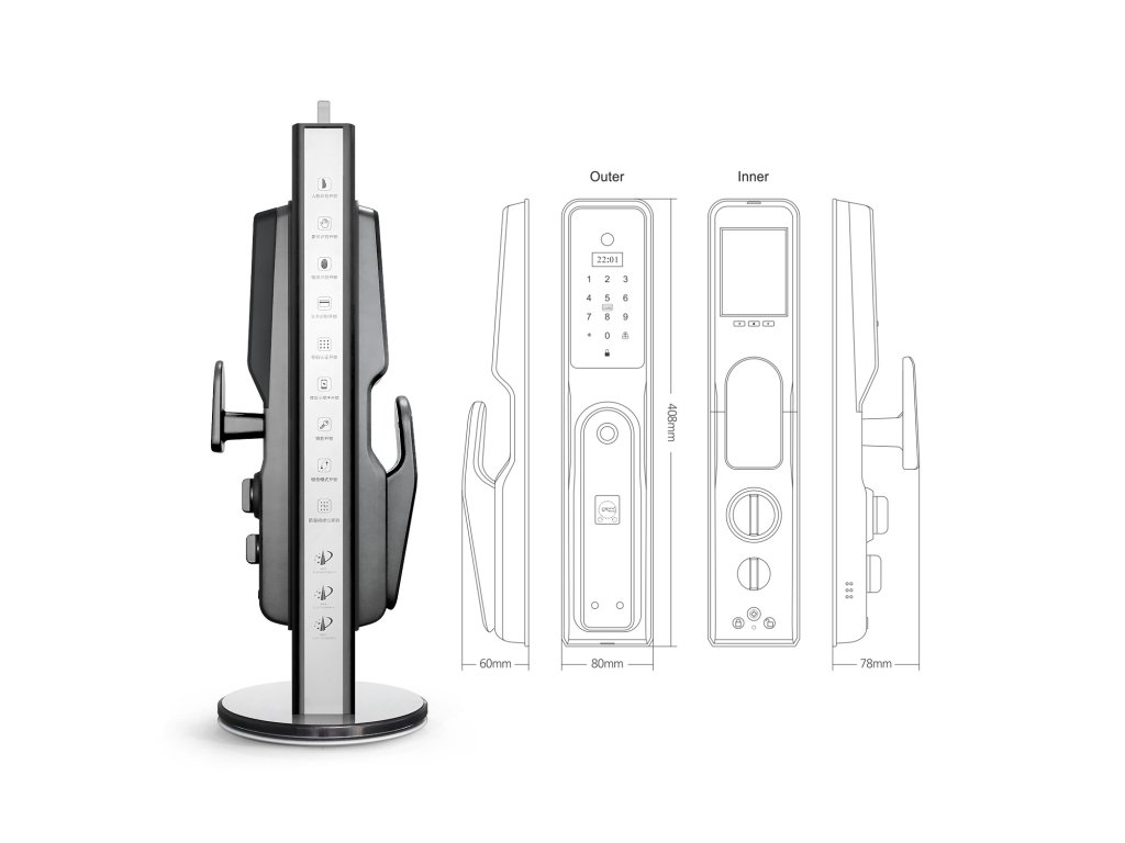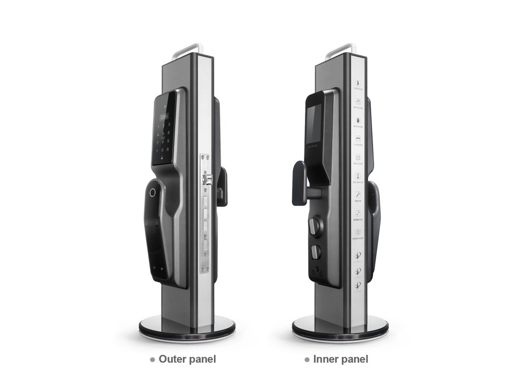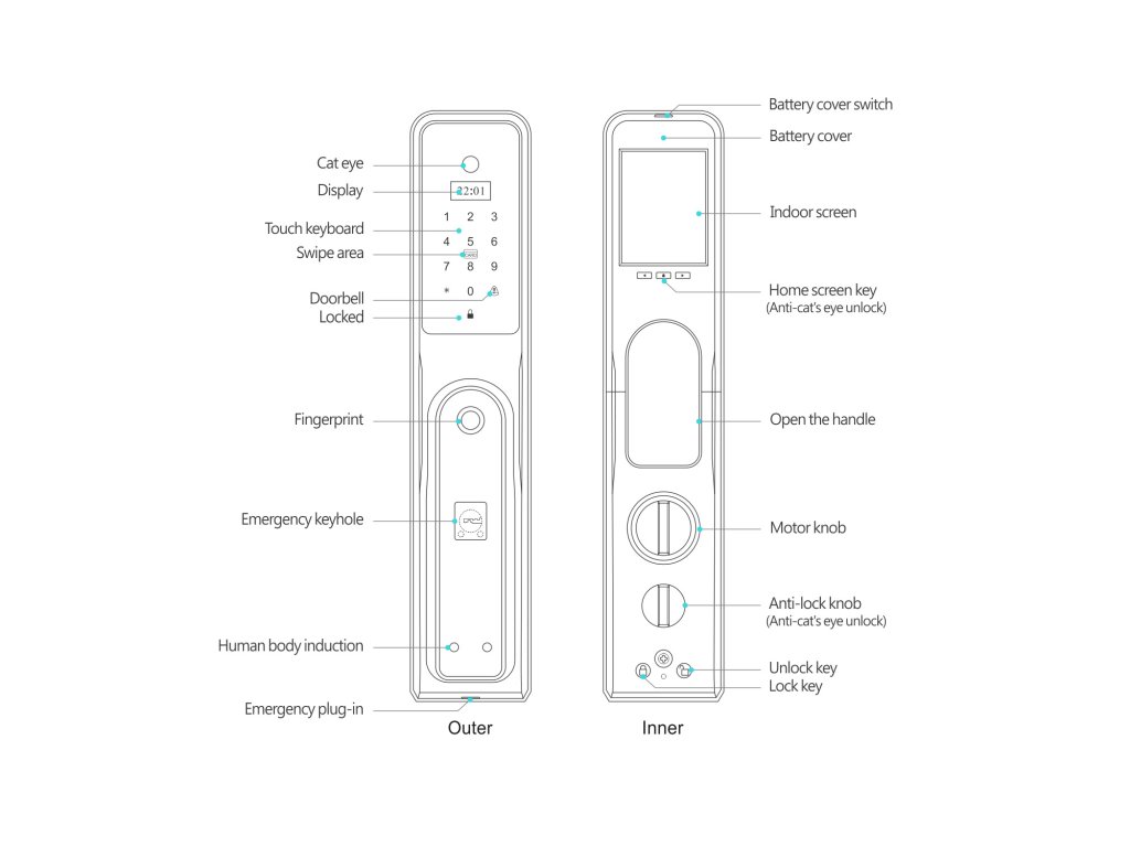 - Na vnější stranu dveří: zde se nachází klávesnice se zvonkovým tlačítkem, čtečka otisků prstů a čtečka ID karet.