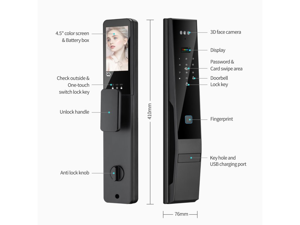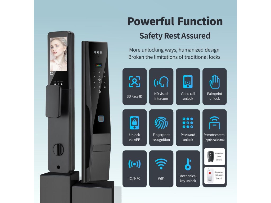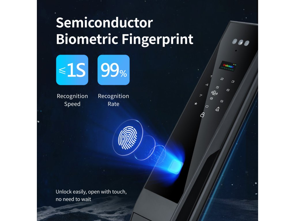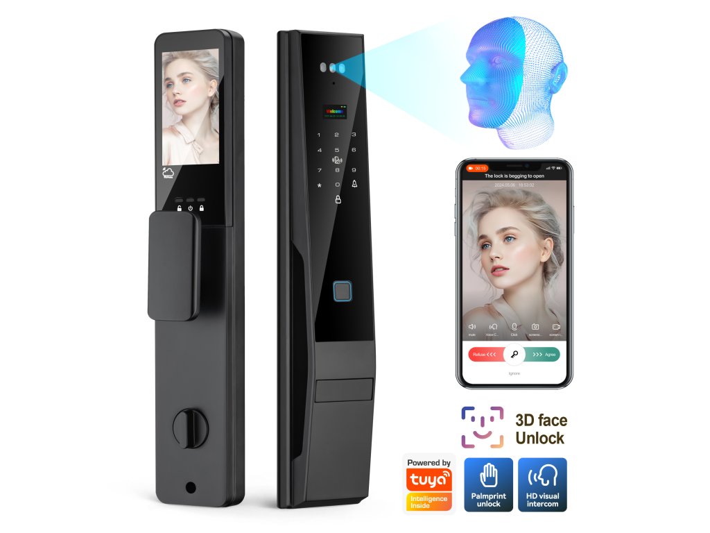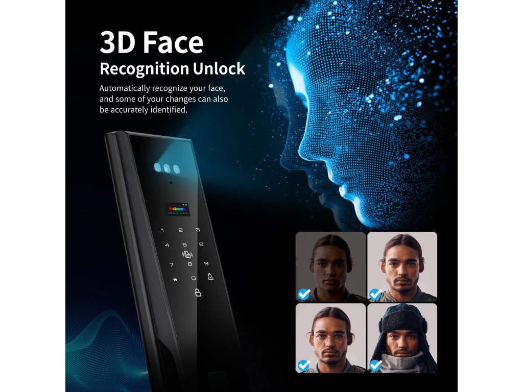 👁️ 3D Rozpoznání obličeje – odemčení během vteřiny Pokročilý 3D skener obličeje odemkne dveře dřív, než se stačíte usmát. Bezpečné, rychlé a naprosto spolehlivé – funguje i ve tmě a při nošení brýlí či čepice. Uložte až 50 obličejů a dlaní pro rodinu a přátele.