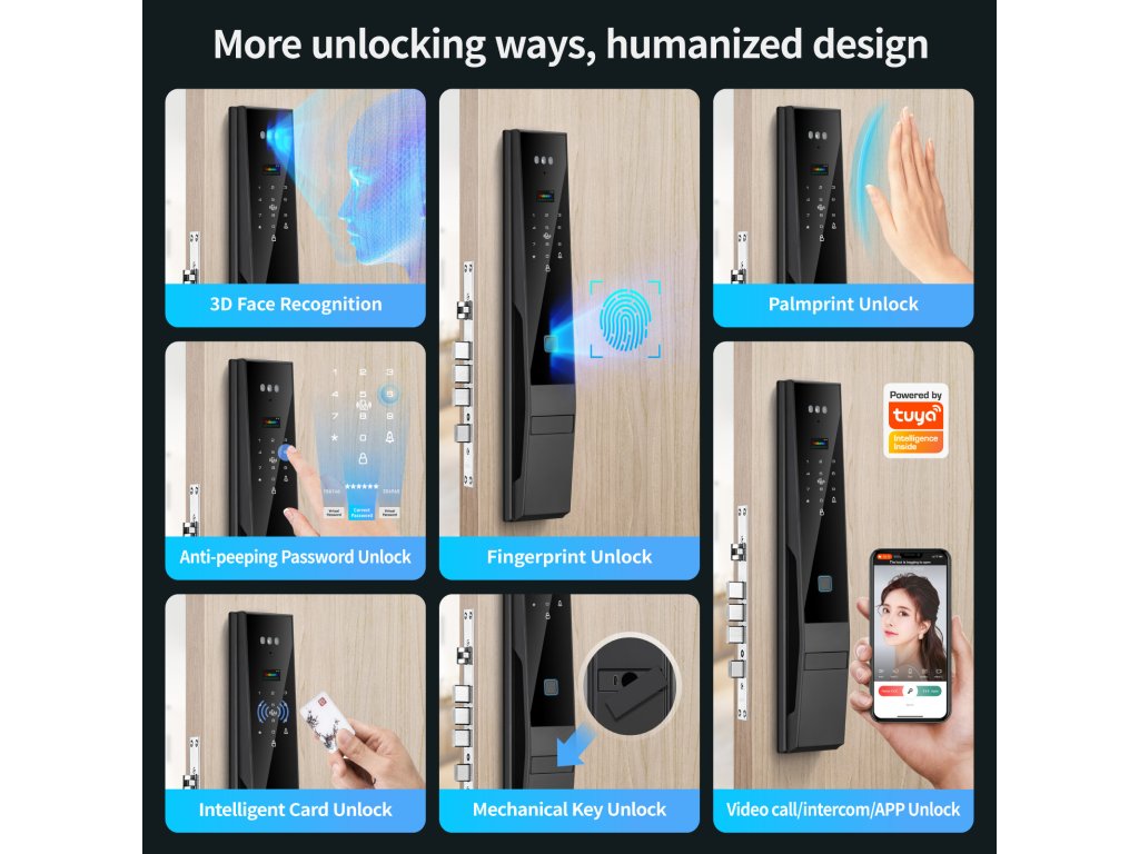 Představujeme revoluční chytrý zámek PST DDL4-TY, který kombinuje špičkovou biometrickou technologii s intuitivním ovládáním. Už žádné hledání klíčů v kabelce, žádné zapomínání PINů. Váš obličej (nebo dokonce dlaň!) je váš klíč – a ten si vždycky nosíte s sebou.