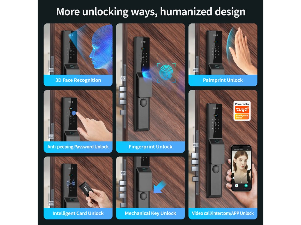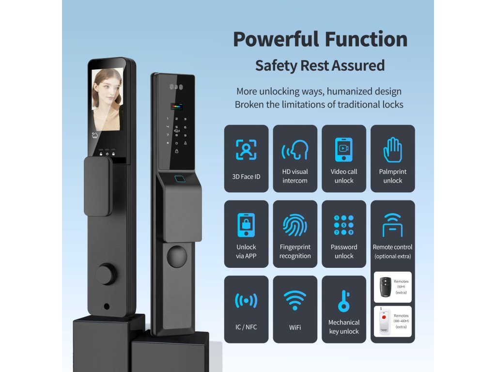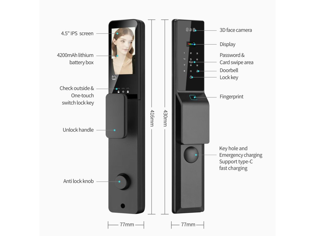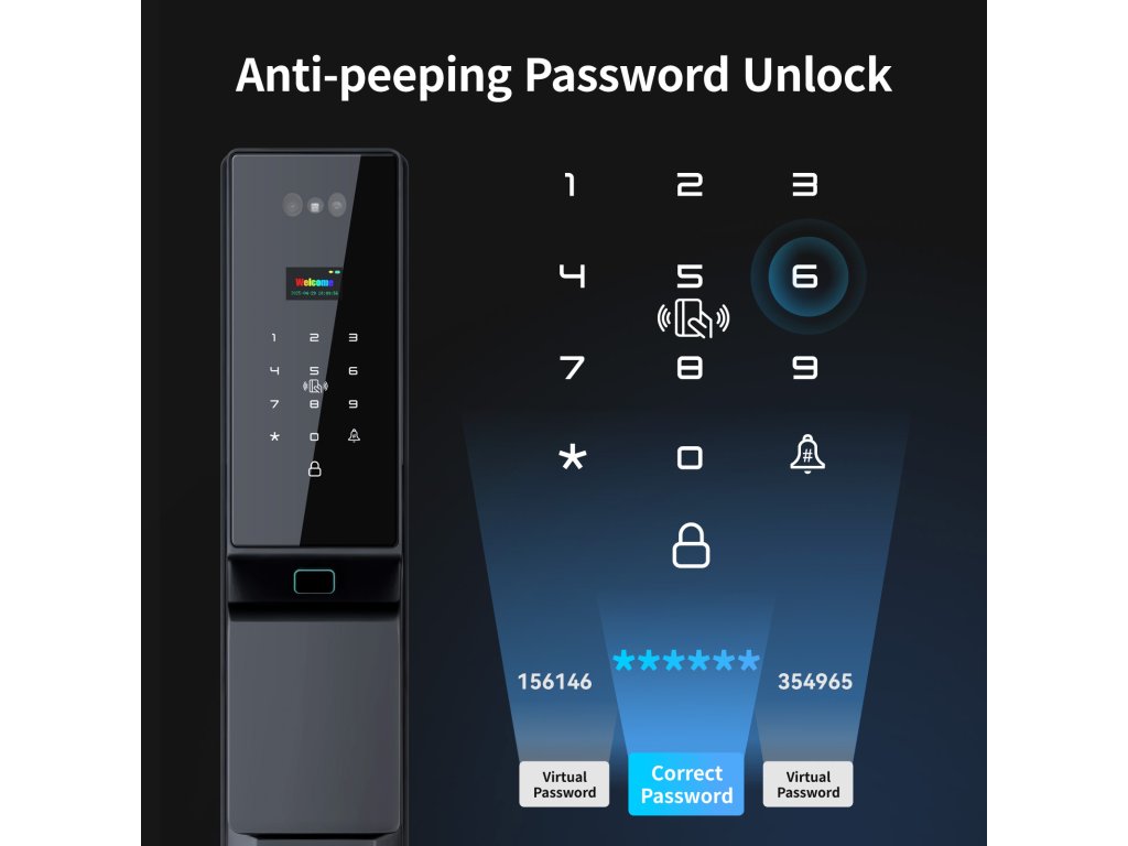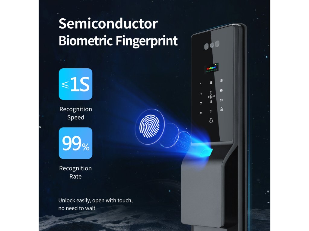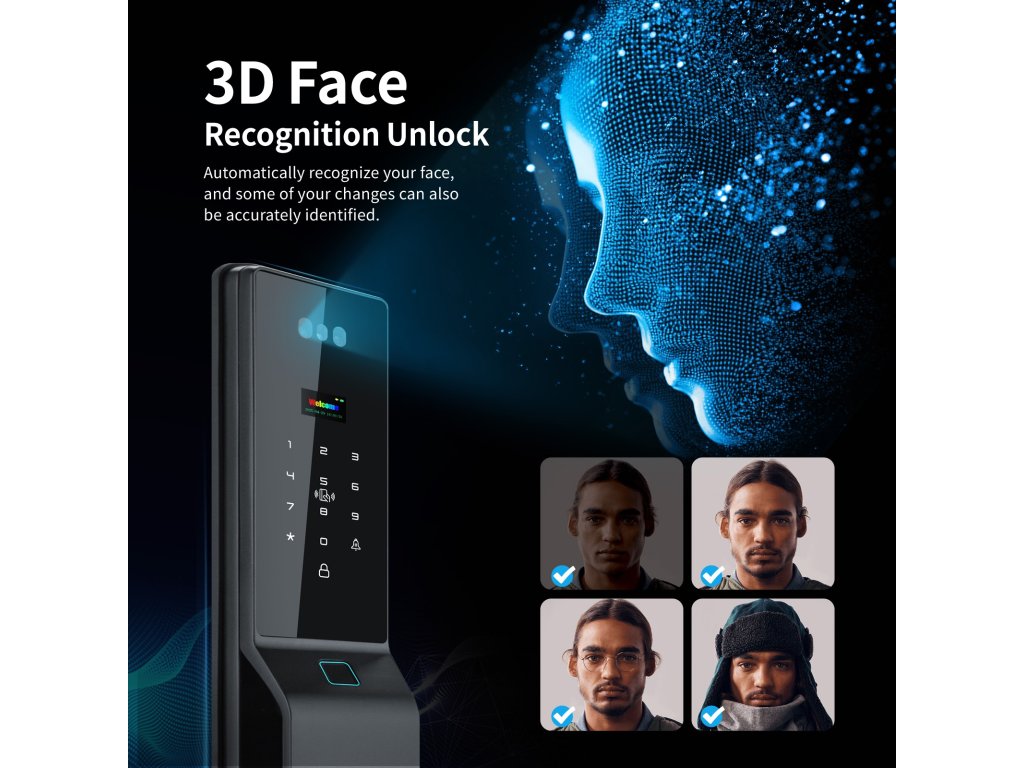 👁️ 3D Rozpoznání obličeje – odemčení během vteřiny Pokročilý 3D skener obličeje odemkne dveře dřív, než se stačíte usmát. Bezpečné, rychlé a naprosto spolehlivé – funguje i ve tmě a při nošení brýlí či čepice. Uložte až 50 obličejů a dlaní pro rodinu a přátele. Lze pracovat se 3 administrátory a celkem 297 otisky, kartami nebo PIN kódy