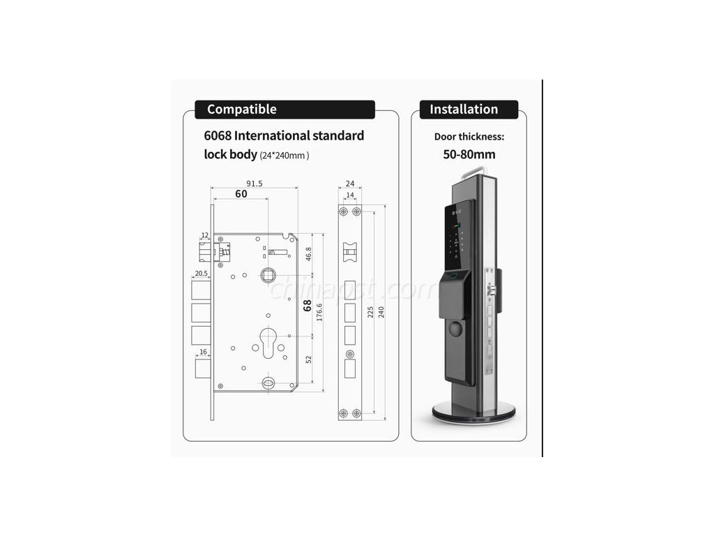 Kompatibilita dveří • Tloušťka dveří: 50–80 mm • Vhodné pro: dřevěné, ocelové, nerezové, hliníkové a mosazné dveře