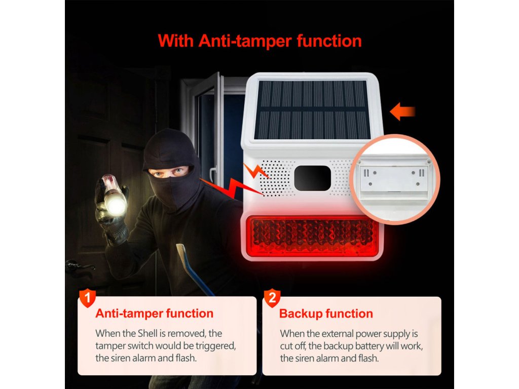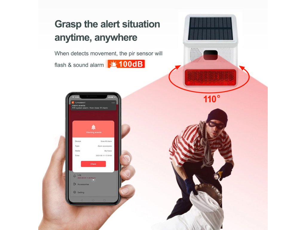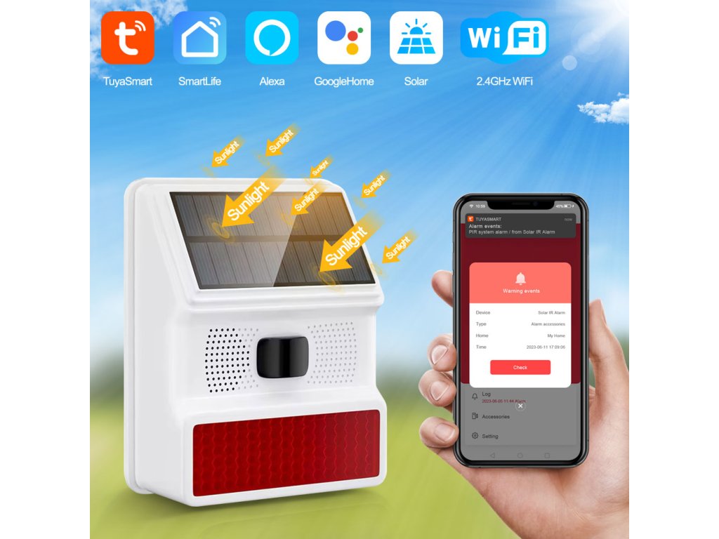 PST PE523 SOLAR TUYA - Chytrá domácnost TuyaSmart - venkovní PIR se sirénou a solárním panelem, 14 zvukových signalizací