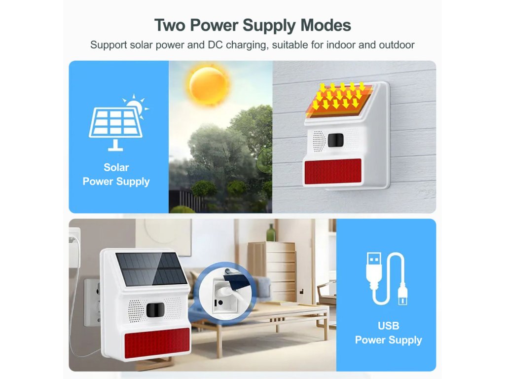 ✅ Bezdrátová technologie – Solární panel na těle sirény zajišťuje permanentní napájení bez kabelů, v případě potřeby lze využít USB-C kabel a sirénu nabít přes adaptér (nejsou součástí balení)