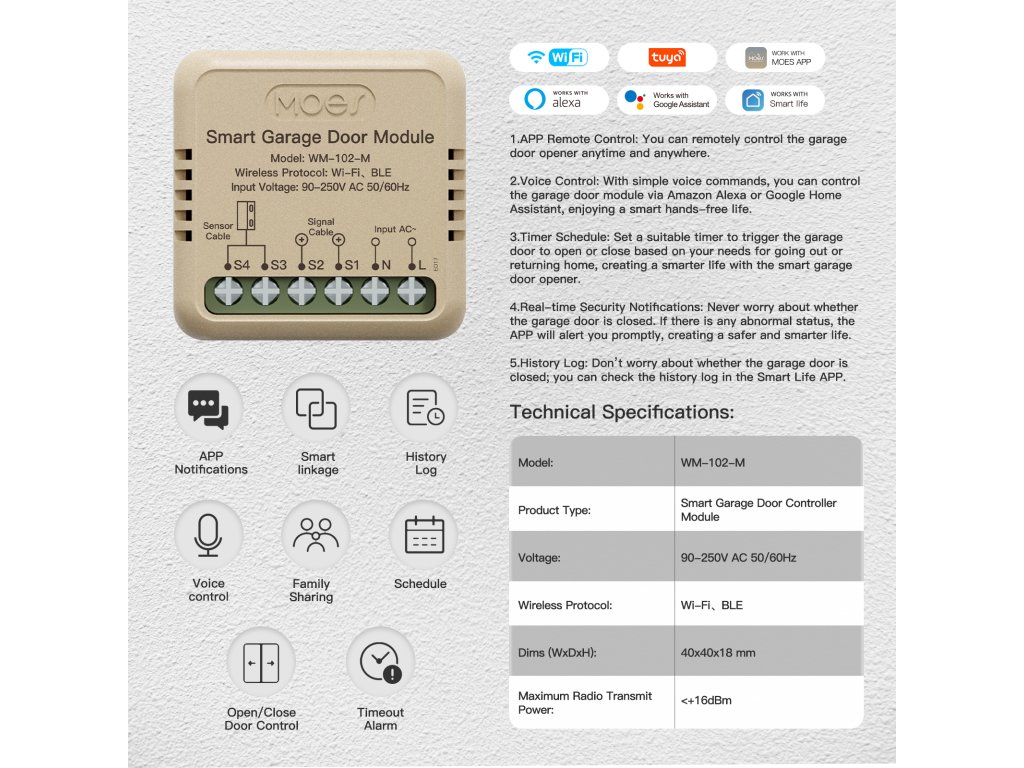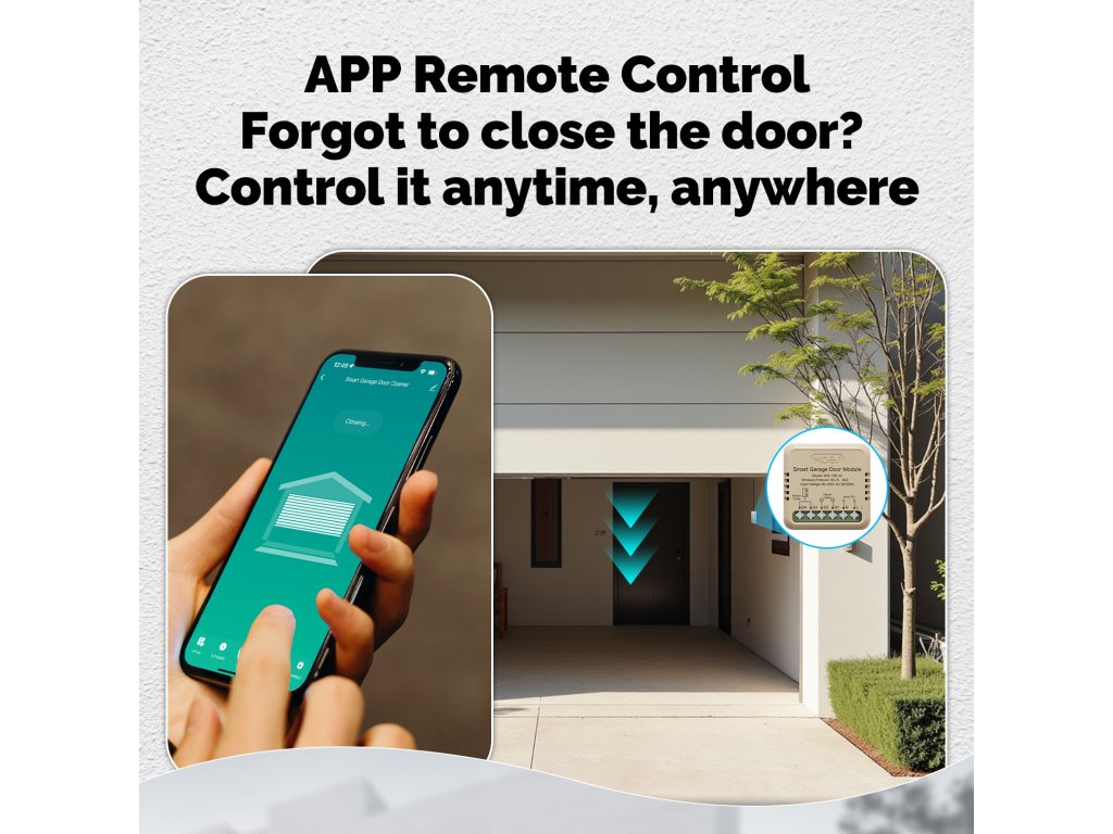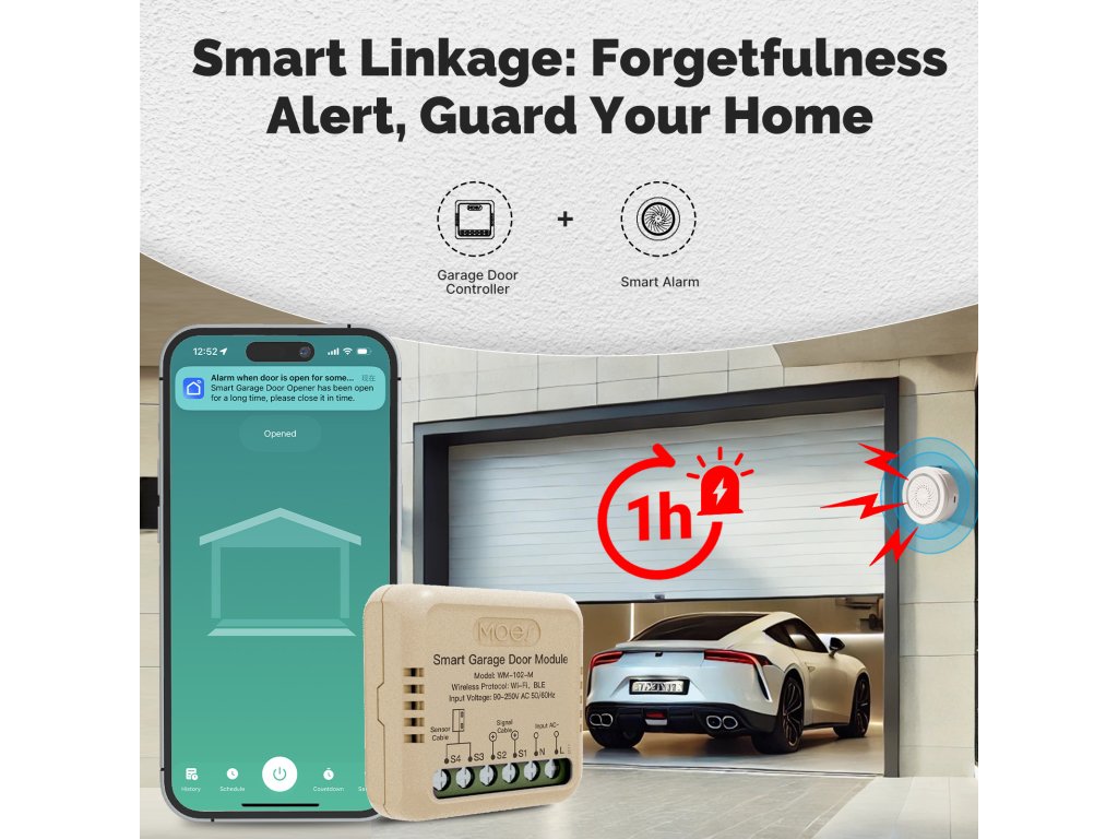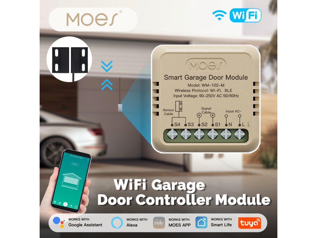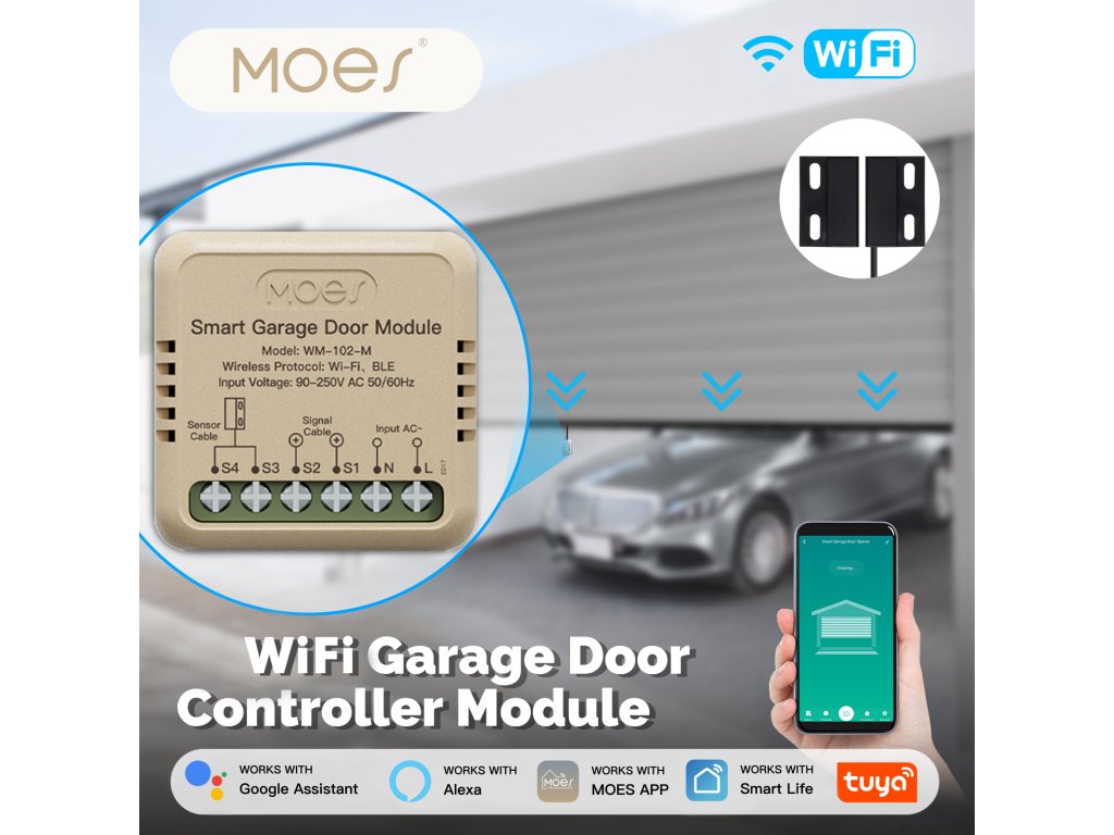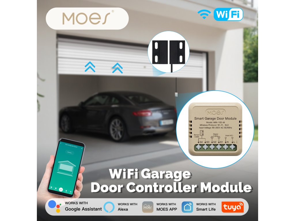 PST WM102M Tuya je bezdrátový otevírač a zavírač garážových vrat a vjezdových bran s kontrolou stavu. Pomocí chytré aplikace TUYA SMART nebo SMART LIVE-SMART LIVING zjistíte, zda-li jsou vrata otevřena nebo zavřena a případně obdržíte upozornění na násilné otevření vrat. Díky chytré aplikaci lze nastavit různé scény otevírání, jako je např. otevření vrat při Vašem příjezdu bez nutnosti vytahování telefonu z kapsy. Samozřejmostí je také časovač pro otevření/zavření vrat nebo funkce odpočítávání.