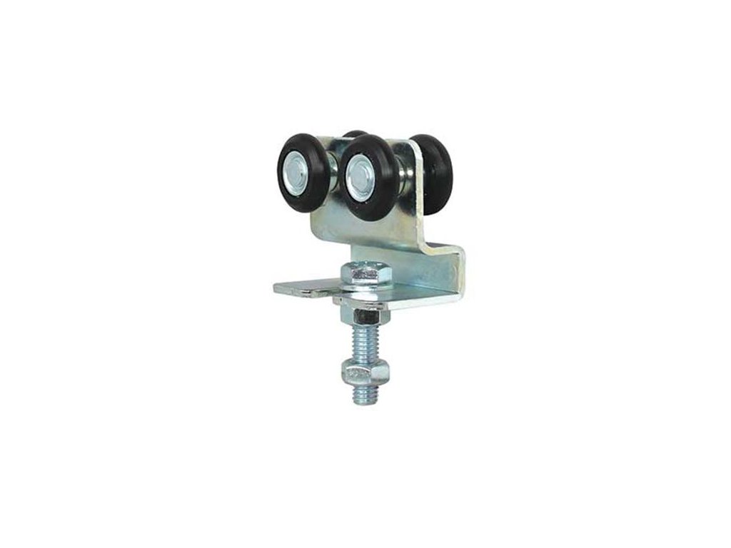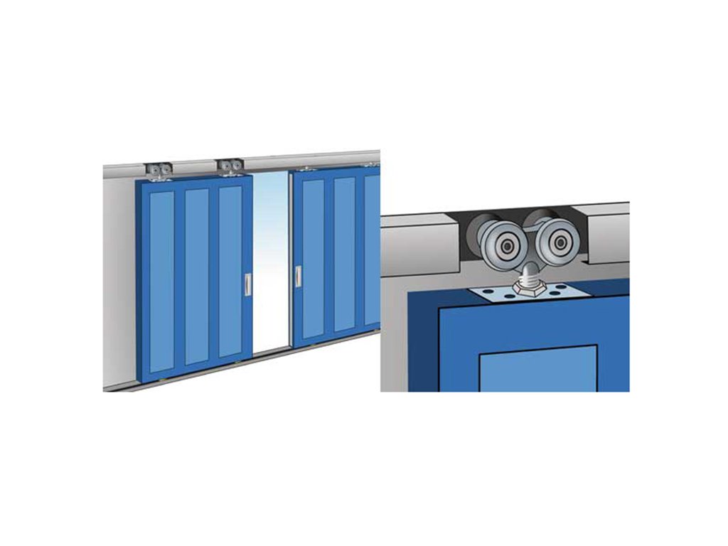 Montáž závěsné kolejnice nad vrata osazená 2 závěsnými vozíky 338P-4 s nylonovými kolečky. Kolejnici dodáváme v 6m délce. Pro uchycení kolejnice dodáváme také 4ks. bočních držáků 329P. Sadu lze rozšířit o další vozíky, držáky nebo další kolejnice pro prodloužení závěsných vrat a pro posuvné dráhy.