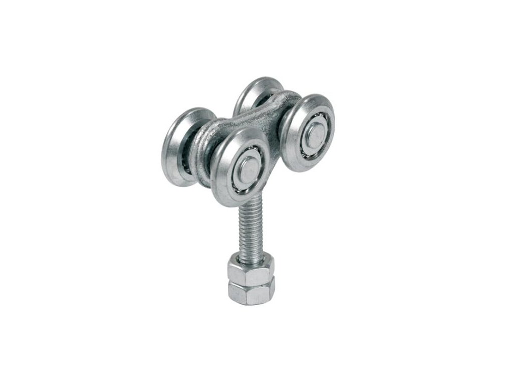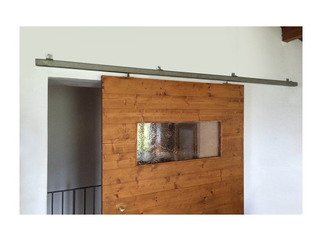 Montáž závěsné kolejnice nad vrata osazená 2 závěsnými vozíky 331P. Kolejnici dodáváme v 6m délce. Pro uchycení kolejnice dodáváme také 4ks. bočních držáků. Sadu lze rozšířit o další vozíky, držáky nebo další kolejnice pro prodloužení posuvné dráhy.