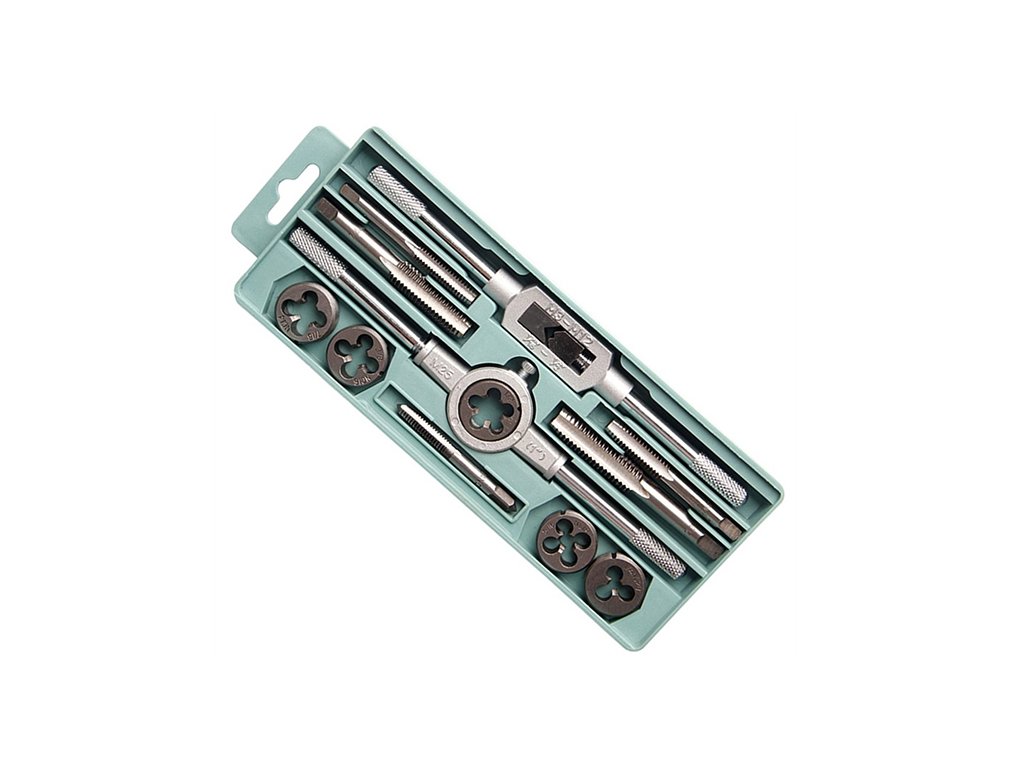 Praktická sada závitníků a oček pro vytvoření metrického závitu nebo šroubení do železných a jiných materiálů.