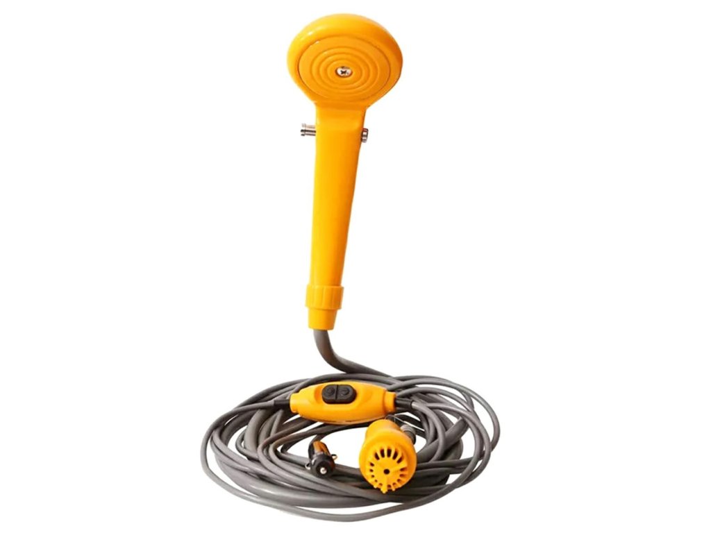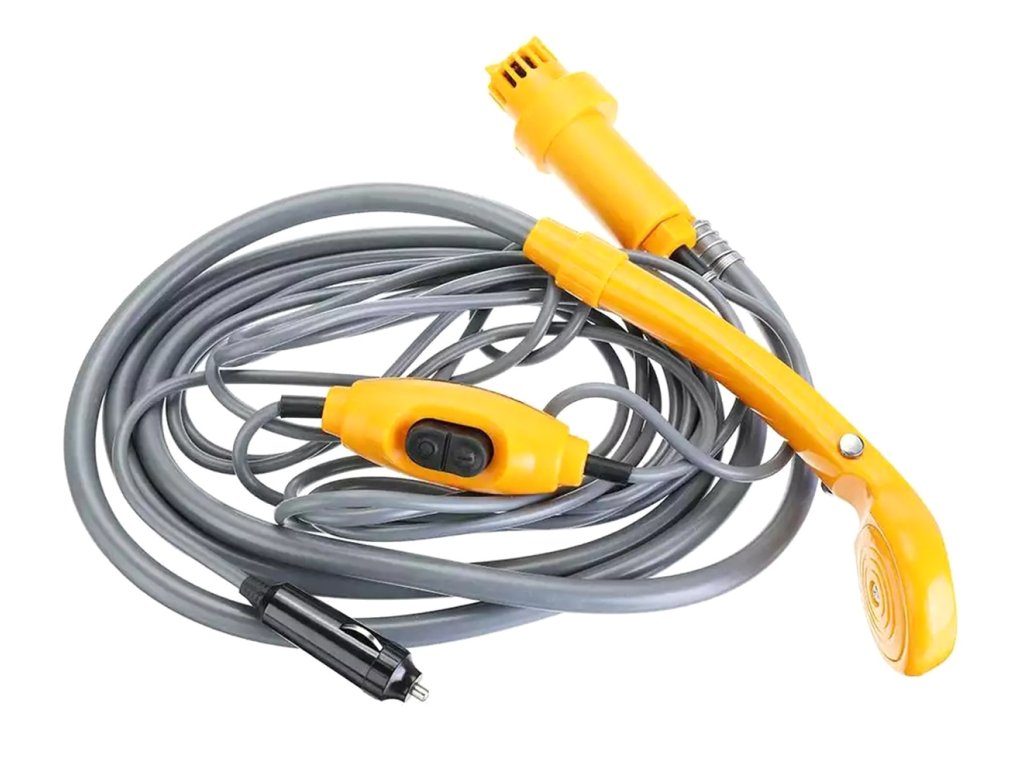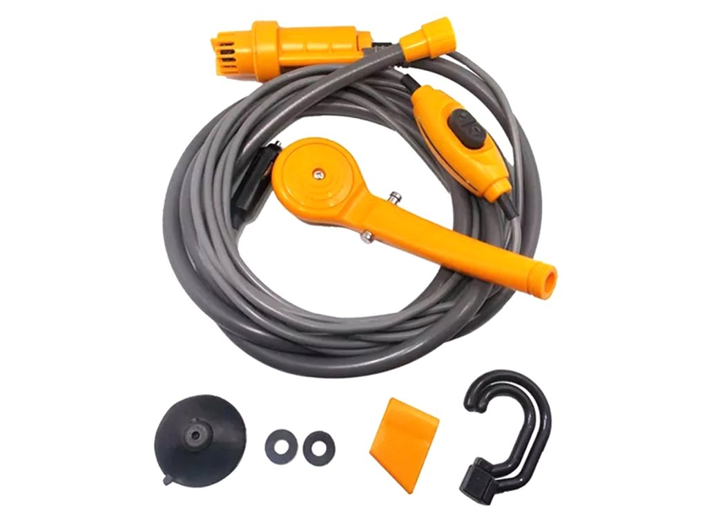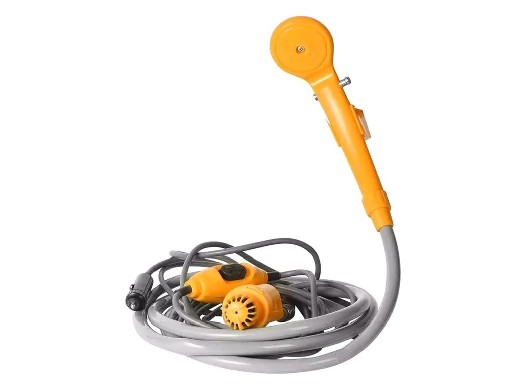 Přenosná sprcha s čerpadlem 12V, s vypínačem a se zástrčkou do zásuvky automobilového zapalovače. Sprchu lze připevnit přísavkou nebo zavěsit na příhodné místo pomocí háčku. Lze také nastavit průchod vody na hlavici sprchy. Balení obsahuje i přenosnou tašku, kterou lze použít i jako nádobu na vodu pro čerpadlo sprchy. Délka hadice cca 2 m, délka napájecího kabelu cca 4,5m. Použití na čerpání výhradně vody.