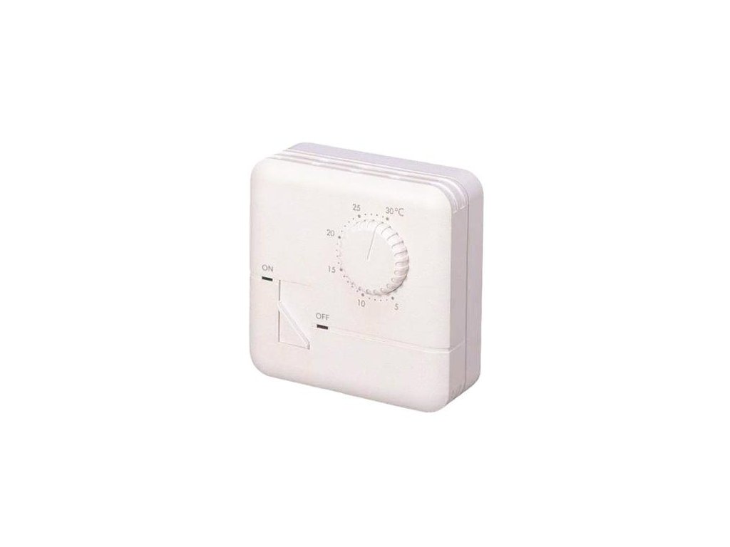 Jednoduchý analogový termostat 5–30°C s vypínačem ON-OFF odporová zátěž 7A,induktivní 3A,rozměry čelního panelu 75×75mm k montáži na stěnu,napáj.230V.