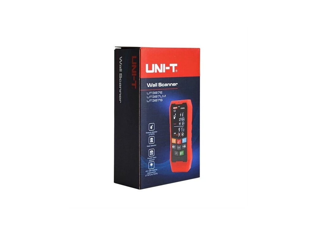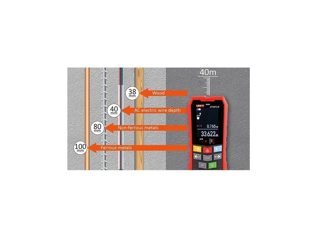 UT 387LM je nástěnný skener, který dokáže detekovat železné i neželezné kovy, elektrické kabely a dřevěné části skryté ve zdech, stropech, podlahách a pod sádrokartonovými deskami. Jako doplňková funkce je zabudován laser pro pohodlné měření vzdálenosti.