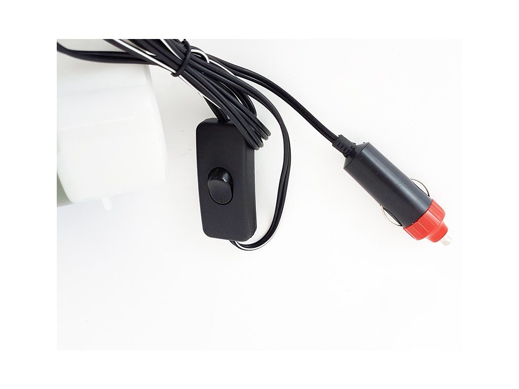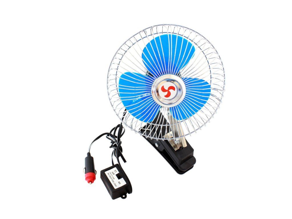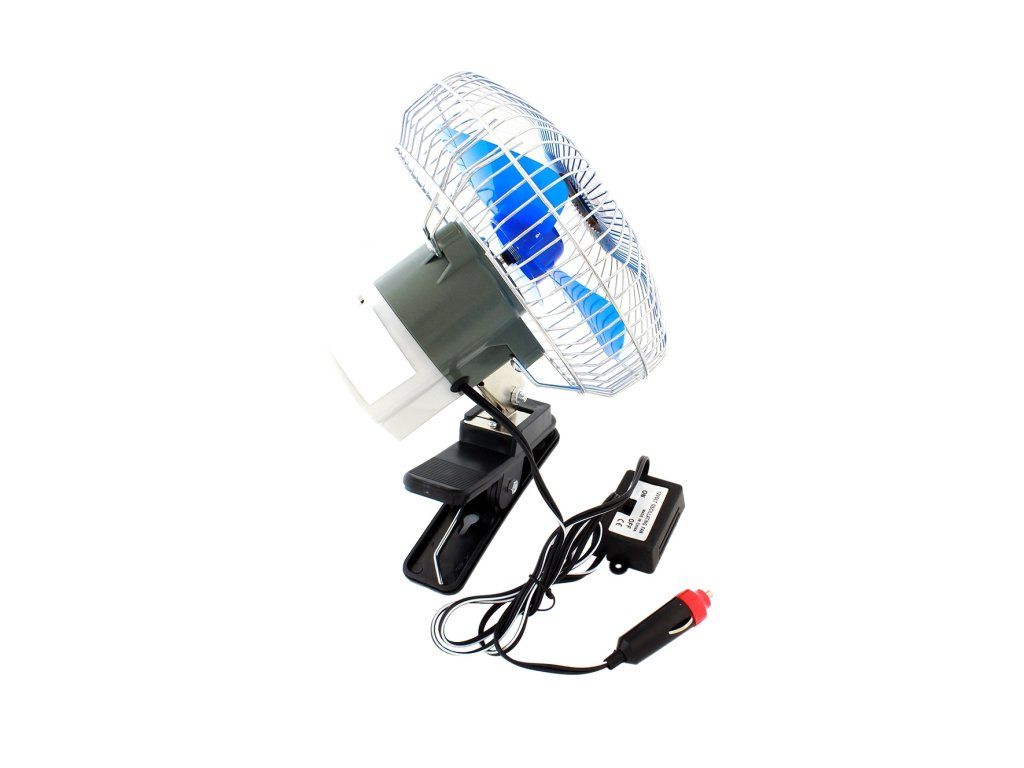 Vozidlový ventilátor s automatickým vratným otočným pohybem, třílopatkový větrák, připevnění pomocí pružinové svorky, přívodní vedení s vypínačem zakončené zástrčkou do zásuvky autozapalovače - 12V.