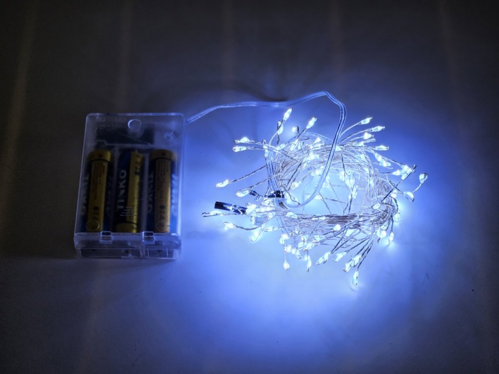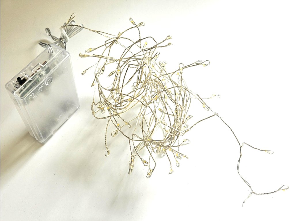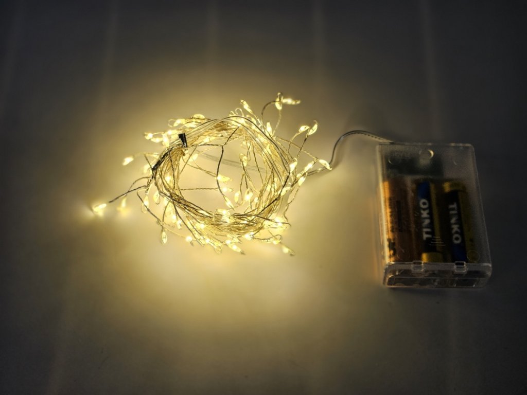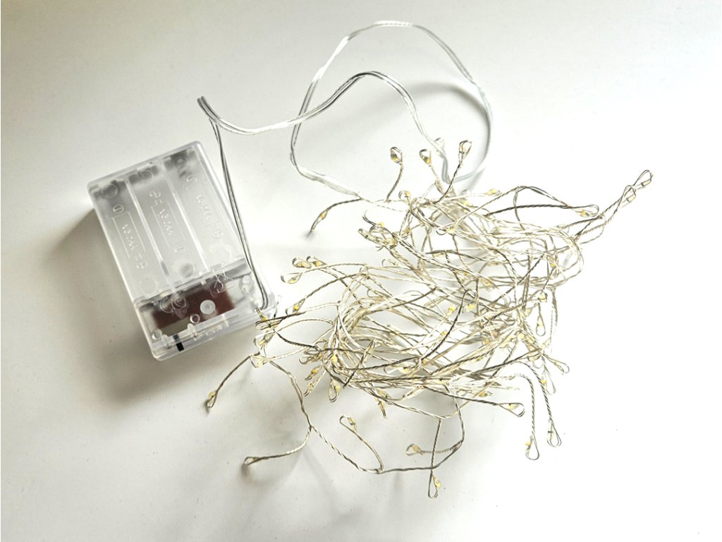 Bateriový světelný dekorační LED řetěz - řetízek na drátku 100LED diod. Napájení je řešeno 3x AA bateriemi, které nejsou součástí balení. Řetěz je pouze na vnitřní použití, proto je vhodný jako samostatná dekorace do interiéru.