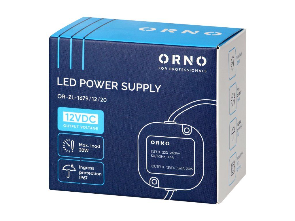 Jednotka pracuje v rozsahu vstupního napětí 220-240 V a poskytuje maximální výkon 12 W. Její vzduchotěsné, vodotěsné plastové pouzdro splňuje stupeň krytí IP67. Vysoká těsnost pouzdra účinně chrání napájecí zdroj před vodou, prachem a dalšími vnějšími vlivy, což zajišťuje dlouhodobý a spolehlivý provoz i v náročném prostředí, zejména venku.